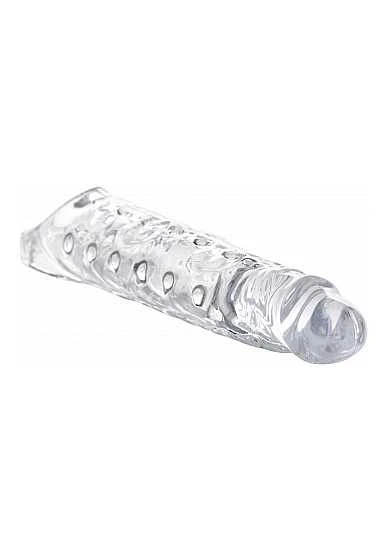 Wrap the strap around your scrotum for more support security and sensitivity! Gain three inches of solid length and about an inch of girth with this penis enhancing sleeve! The firm but flexible material feels realistic with a bold head and bulging veins all down the shaft. Just lube up and shove your dick inside to give your partner a new sensation to try out during sex! The solid 3 inch tip is followed by a hollow interior that allows for a snug and secure fit. You will love the huge nubs massaging your member on the inside. This phthalate-free and body-safe material is compatible with silicone and water-based lubricants. Use warm water and mild soap or a toy cleaner to clean after use.