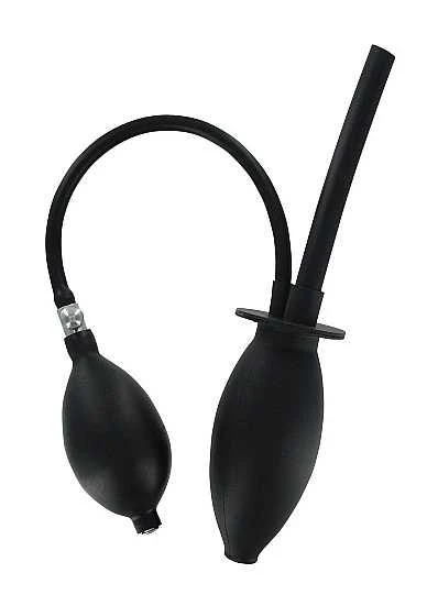 This butt plug has a rubber tube running through it. Fluids can pass through while it is inflated! Once the plug is inserted and inflated the large rubber hose can be hooked to an enema bag. When the time comes to administer the enema the fluid will flow through the enema butt plug into the colon. The inflatable plug prevents pushing out the plug and the enema until the desired time arrives.