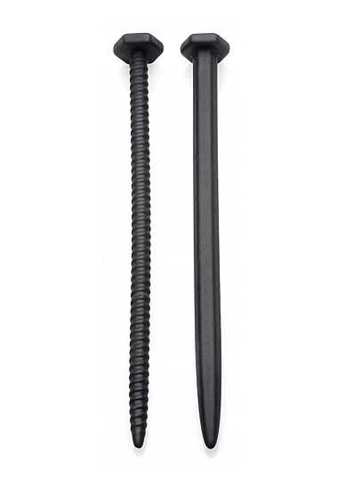 Two irresistible shapes for your penetrative pleasure! Both sounds are shaped like heavy-duty hardware tempting you with a smooth hexagonal nail and a spiral-textured screw. The flexibility and silkiness of the material ensures a comfortable insertion as it conforms to your inner curves. Fulfill your most hardcore fantasies with this dastardly duo! Made of premium silicone these sounding rods are hypoallergenic and easy to clean with mild soap and warm water. Do not use with silicone lubricant.