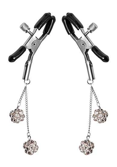 This sparkling set of rhinestone adorned nipple clamps will give you a dazzling way to make sure their eyes stay on you! The cube shaped embellishments are set on all sides with clear sparkling gems which catch the light with every movement. The clamps themselves are vinyl coated with a thumb screw that allows you to adjust the tightness as you need it. The adjustable pressure make them ideal for all experience levels.