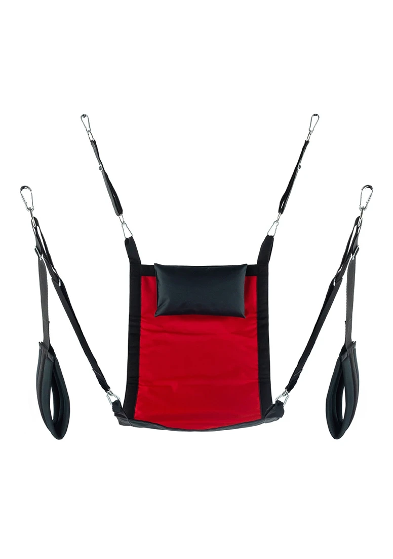 Rectangular canvas sling – 4 points – Full set – Red – Hier is een draagdoek van rode stof met alle toebehoren: de hangers met de metalen karabijnhaken / de gewatteerde voetsteunen (11cm breed) / het kussen (23 x 38cm). De sling is rechthoekig van vorm. Materiaal: polyester. Met de opbergtas