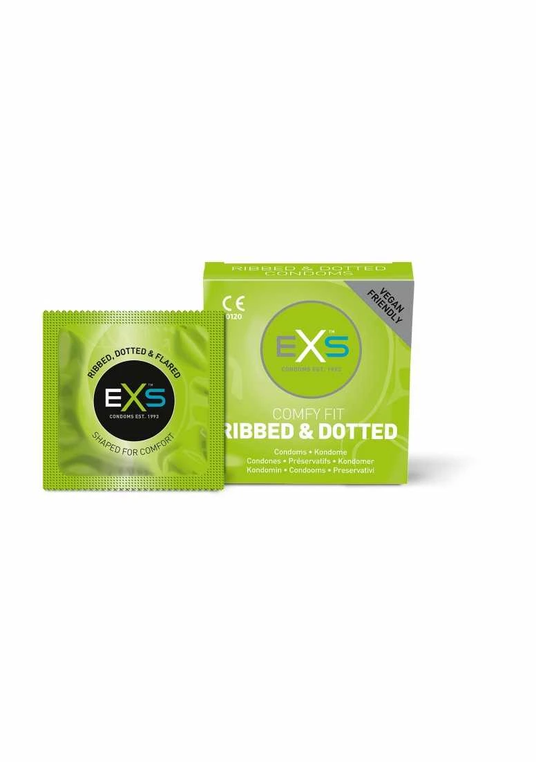 Ribbed and dotted, natural latex, flared, teat ended, and silicone lubricated condomEXS Ribbed and Dotted condoms are 56mm wide with a comfy flared teat end. This EXS condom is ribbed and dotted for extra stimulation for your partner. EXS ribbed and dotted have no latex smell and are made from a thin yet strong silky latex.EXS ribbed and dotted condoms are vigorously tested to the European standards and by the British Standards Institute (BSI)