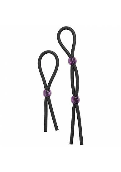Slip one of these penis ties on and enjoy the ride of your life. Made of high-quality and hygienically-superior silicone, these rings are super stretchy and will adjust to accommodate most sizes. This two ring set features one tie for just the penis and another for the penis and testicles. The clear ball accents are used to adjust the sizes of these completely sturdy and flexible ties offering you long-lasting erections and helping to prolong ejaculation. Non-phthalate. Available in Purple and Black